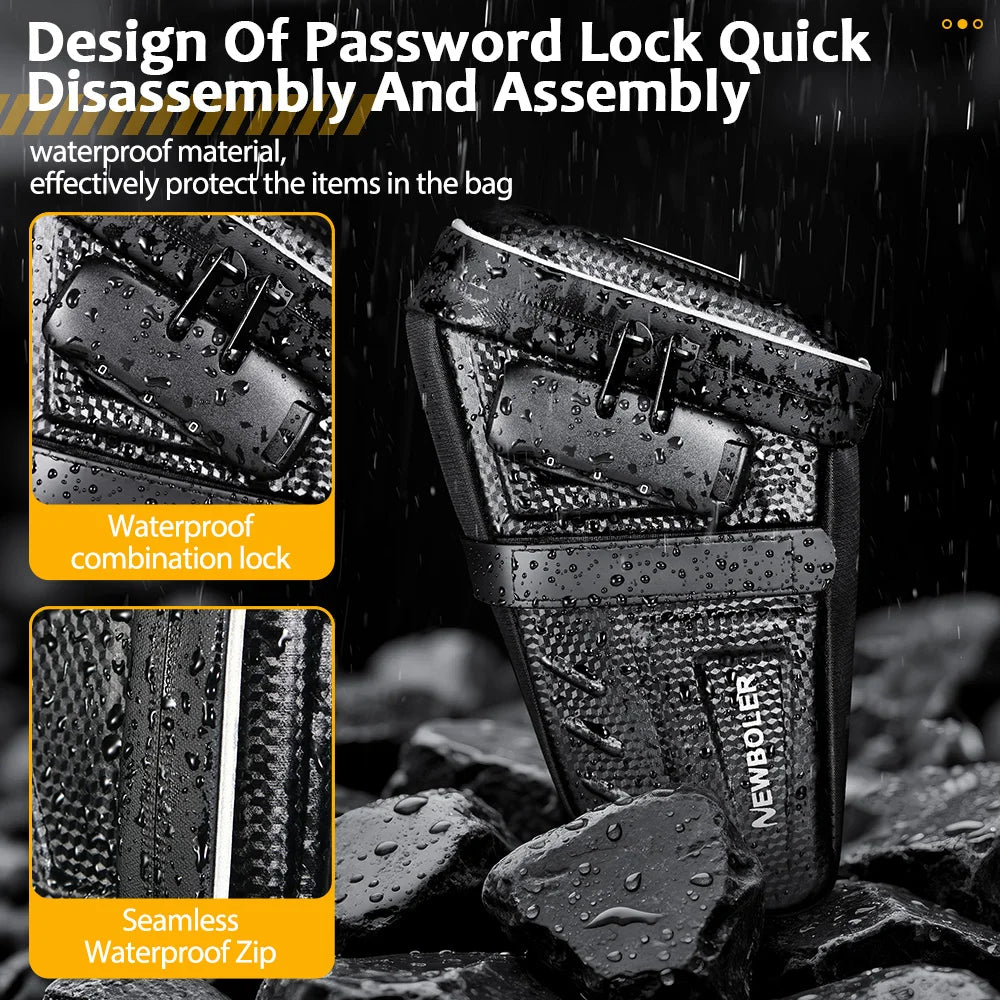 This waterproof saddle bag offers a secure 2.5L storage solution for your mountain or road bike. Crafted from durable EVA and polyester fiber, it features a convenient password lock (default "000") to keep your belongings safe. The bag’s reflective elements enhance visibility for added safety during night rides, while its rainproof design protects your gear no matter the weather. Stylish and practical, it’s an essential accessory for any cyclist looking to ride with confidence.