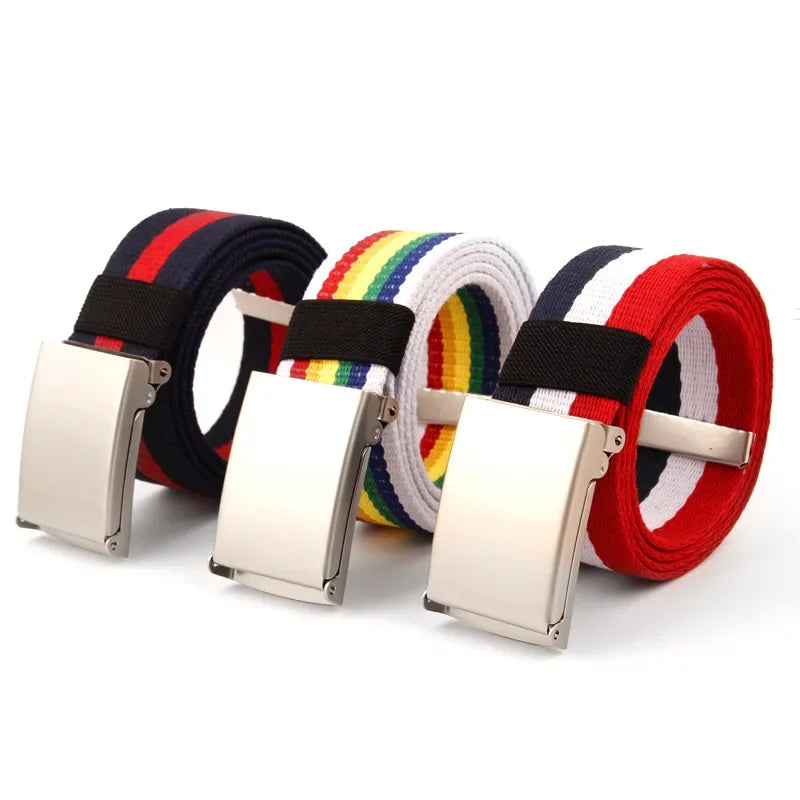 Spectrum is for those who celebrate diversity and color. This vibrant rainbow canvas belt with metal buckle is designed for the well-dressed individual who understands that renewal means embracing your full spectrum—all the colors, moods, and possibilities that spring and summer bring.